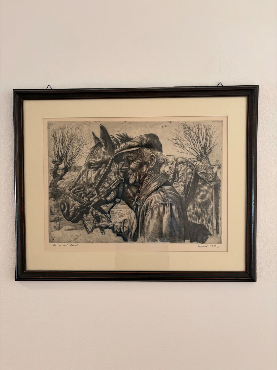 Die Radierung Bauer mit Pferd zeigt einen Mann mit seinem Arbeitspferd.