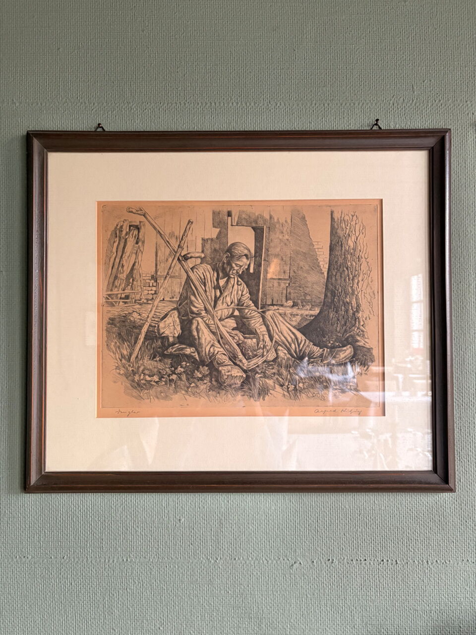 Die Radierung Sitzender Mann am Arbeiten zeigt eine alltägliche Arbeitsszene im ländlichen Raum.