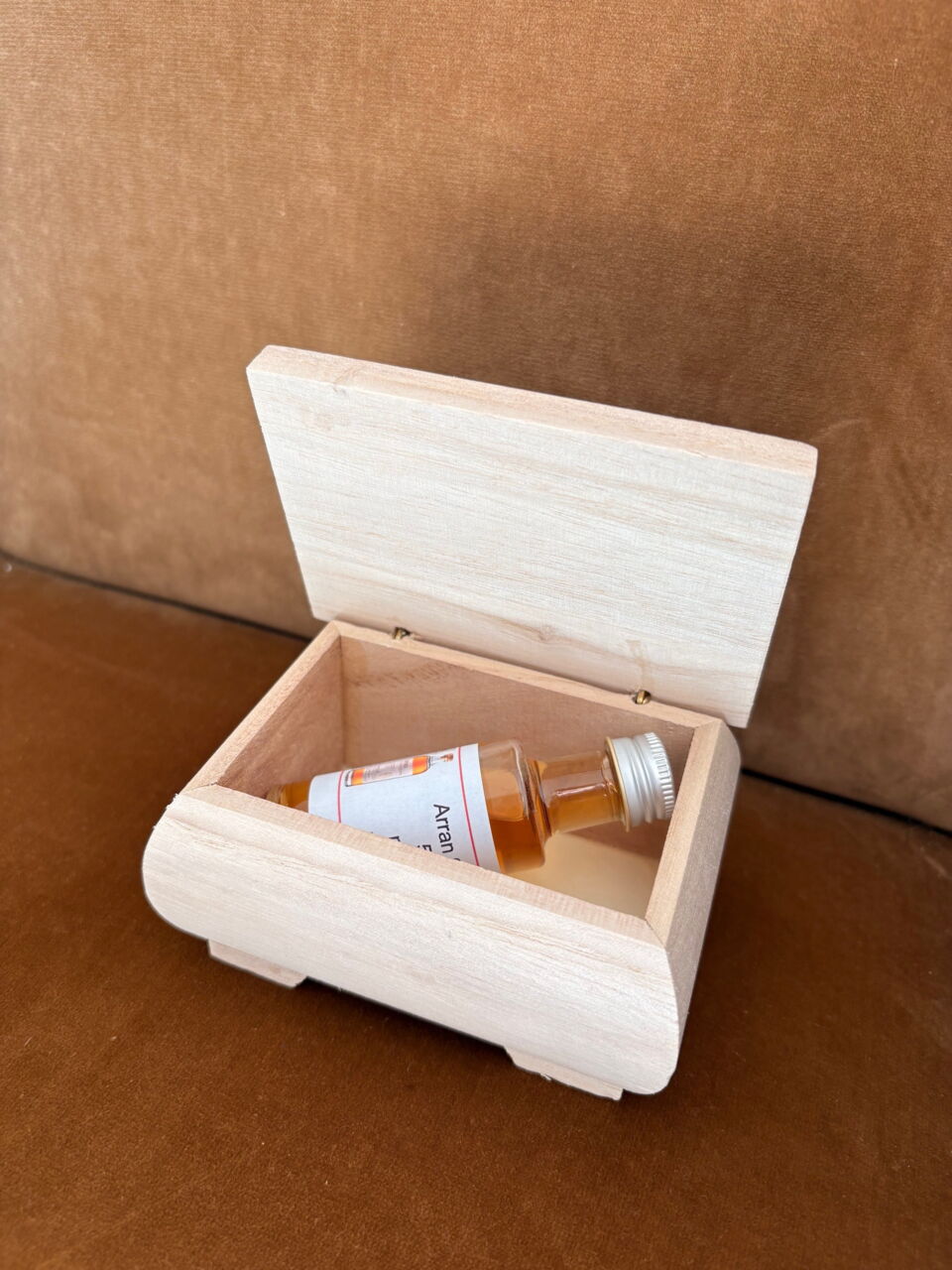 Jedes Ticket beinhaltet eine exklusive Geschenkidee: Eine wunderschöne kleine Schatztruhe aus Holz, in der sich ein von Barmeister Sebastian Püttmann selbst abgefüllter Whisky befindet – Arran Sherry Cask. Ideal zum Verschenken oder zum selbst Genießen.