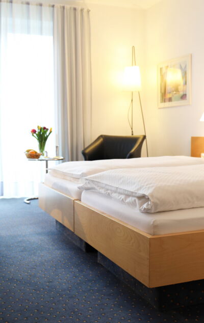 Das auf der Website gezeigte Bild zeigt eines unserer Doppelzimmer mit einem gemütlichen Bett als zentralem Ruhepol. Im Hintergrund lädt ein Sessel mit Stehlampe zu einem ruhigen Moment mit Buch oder Getränk ein und unterstreicht die entspannte Atmosphäre unserer Zimmer.